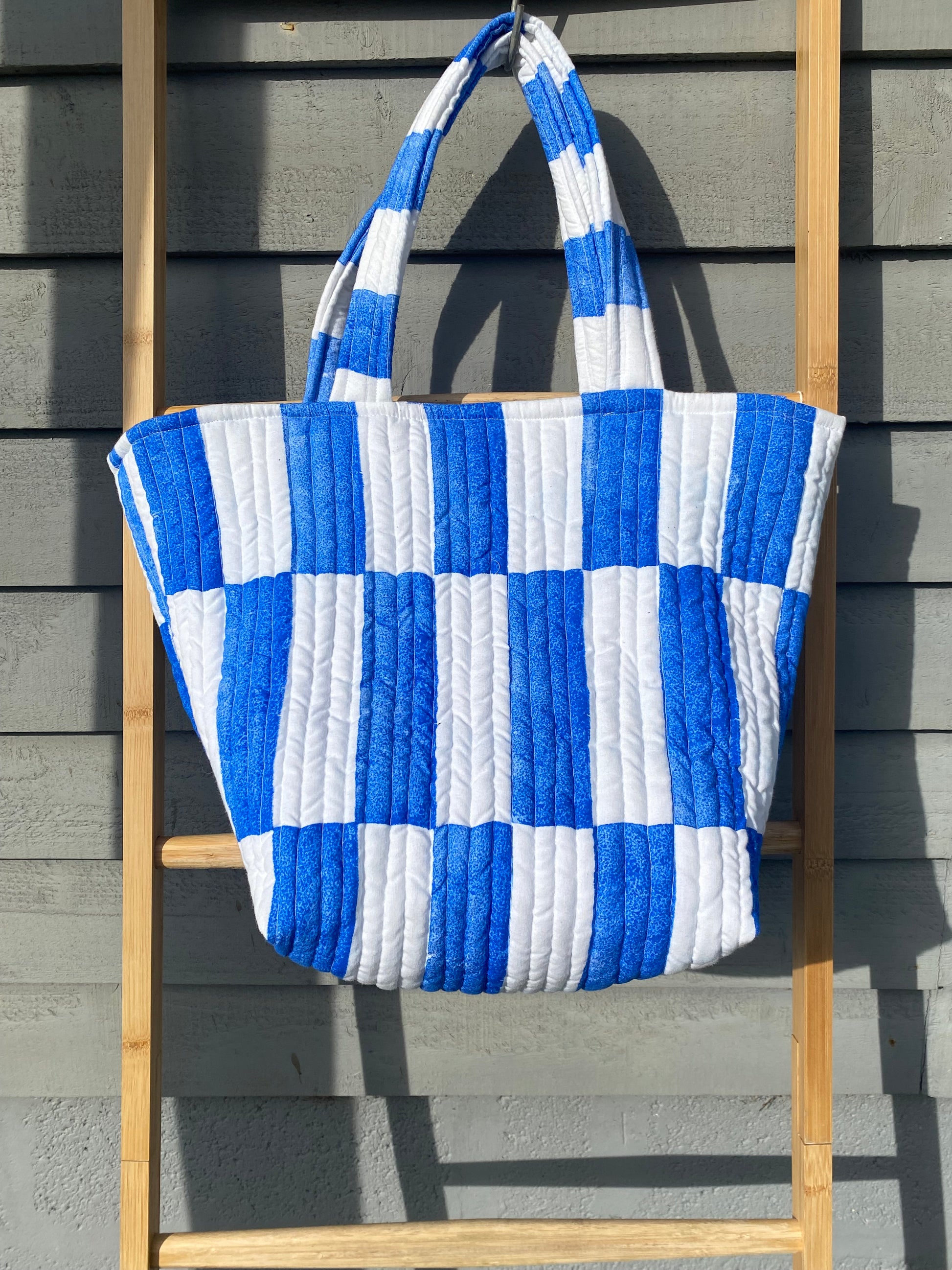 Our quilted block check print in blue quilted tote bucket bags are made by the method of hand block printing on soft cotton. Lined with bicycle block printed cotton lining, with quilted slip pockets and metal zipper.