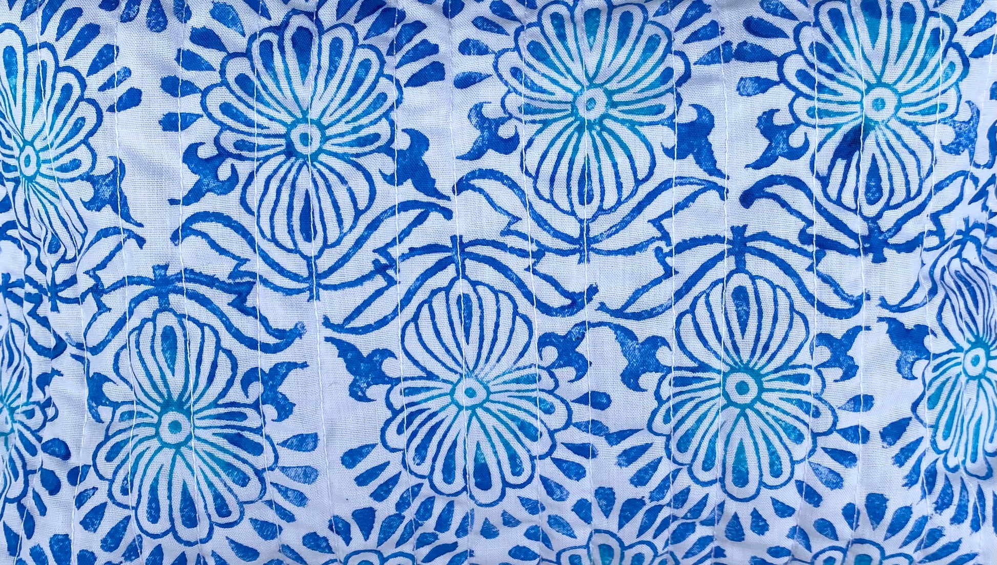 Our quilted wildflower print in blue and turquoise wash bags are made by the method of hand block printing on soft cotton. Lined with waterproof lining and metal zipper.