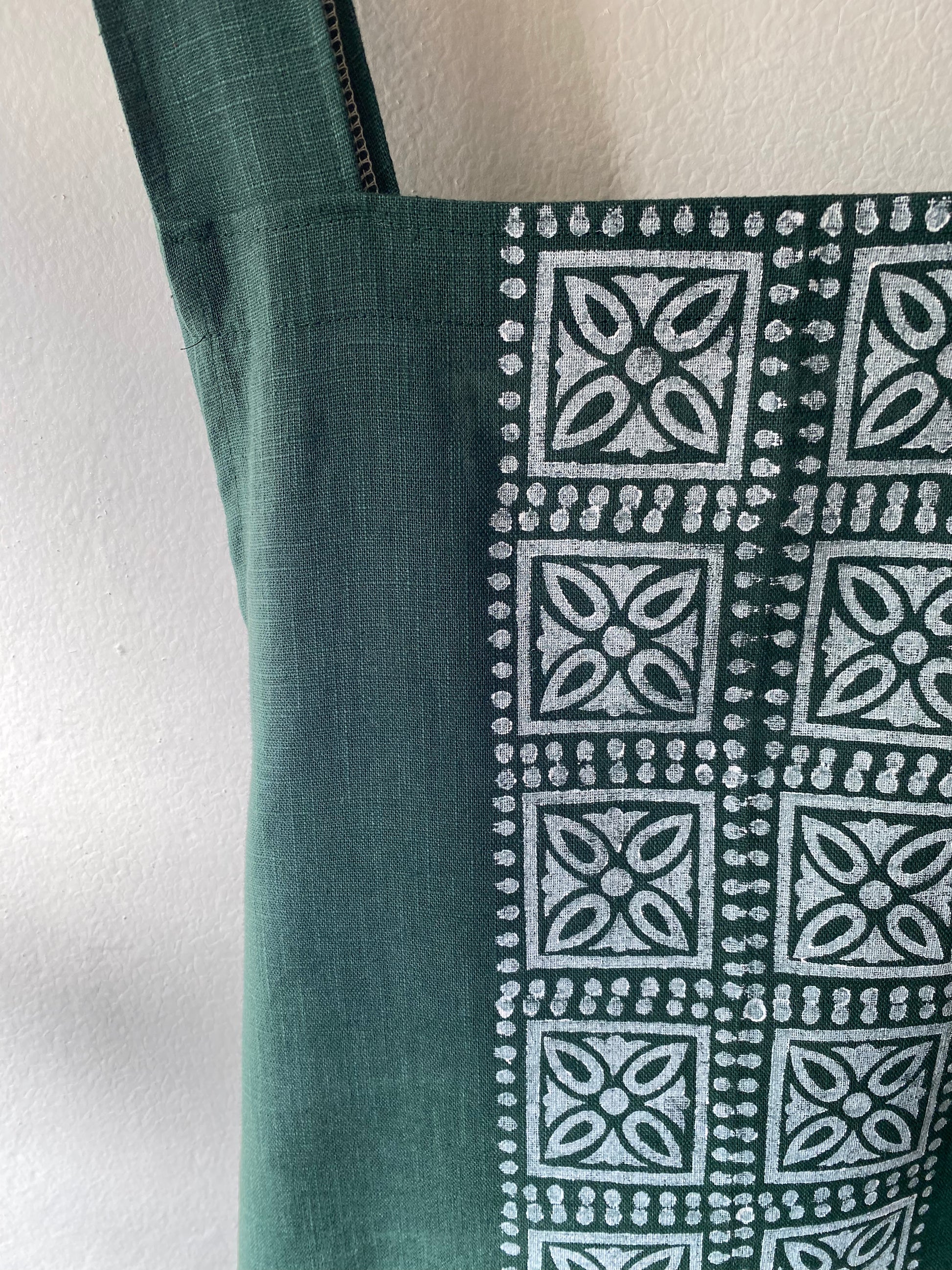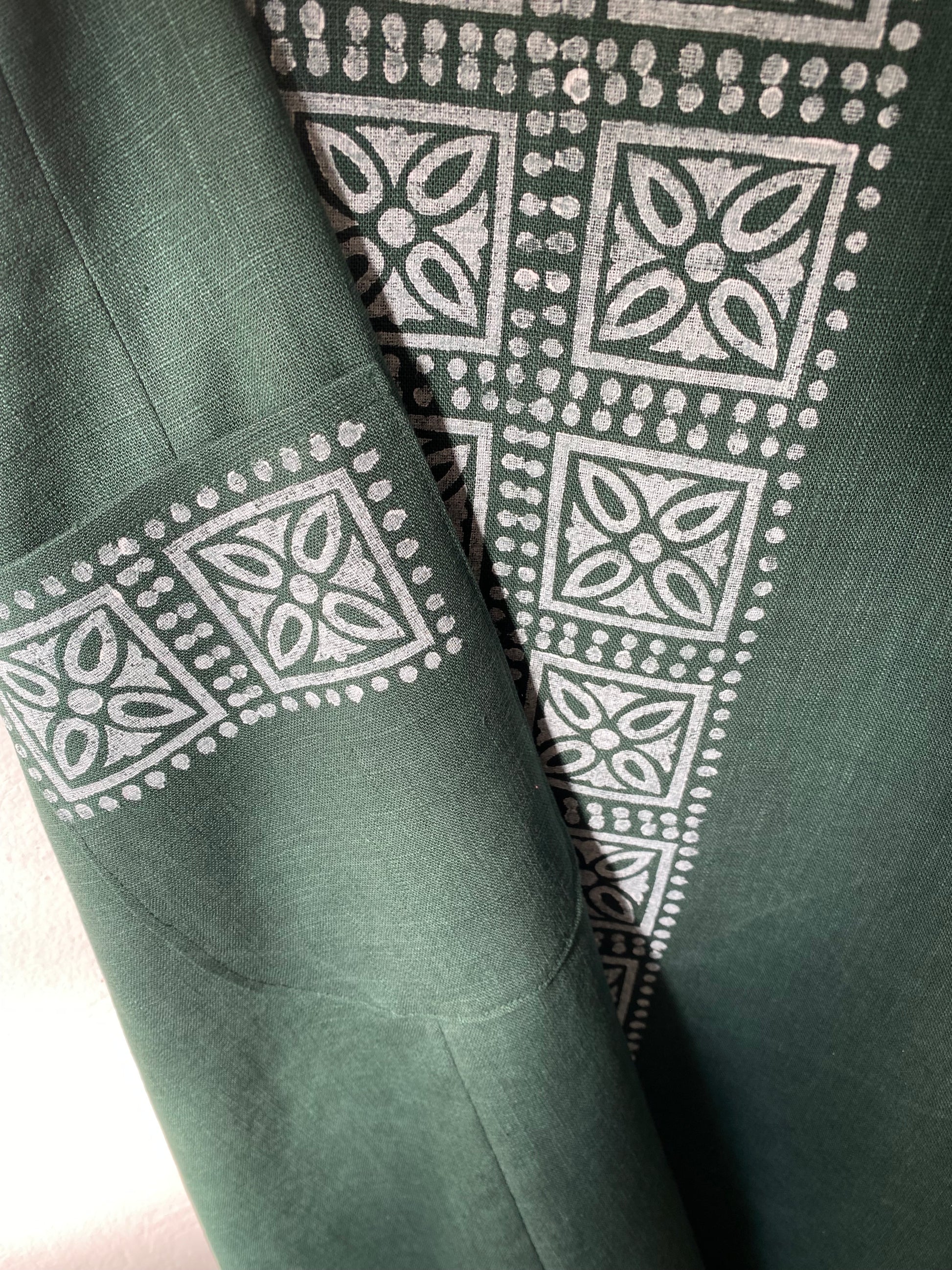 Indian flower block stripe, in white on forest green, pure sustainable linen.